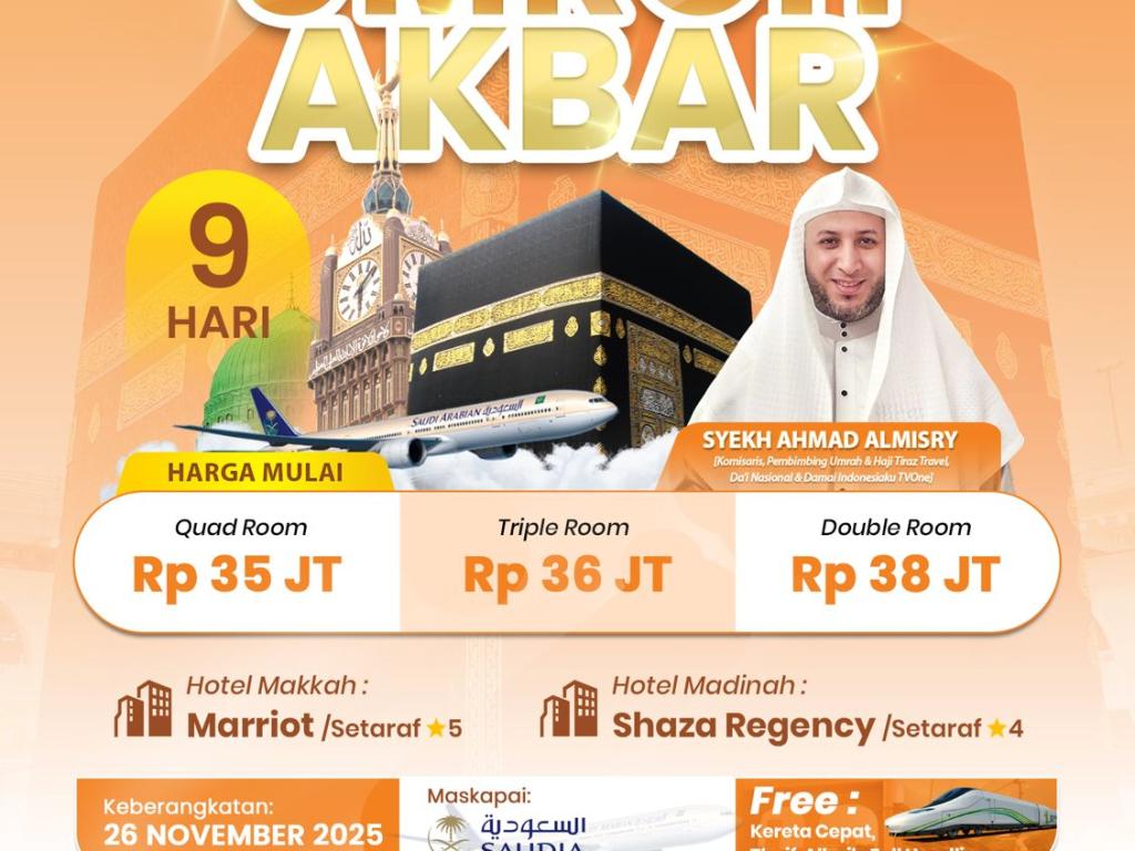 - Perlengkapan : Koper kabin, koper bagasi, tas paspor, kain ihram/mukena, sandal, buku manasik, kain seragam, syal, & sabuk